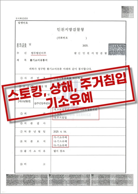 법무법인 이루의 이러한 변호 전략과 조력으로 인해, 사건은 예상과 달리 중한 처벌로 이어지지 않았습니다. 검찰은 스토킹범죄의처벌등에관한법률위반, 상해, 주거침입 모두에 대하여 기소유예 처분을 내렸습니다.