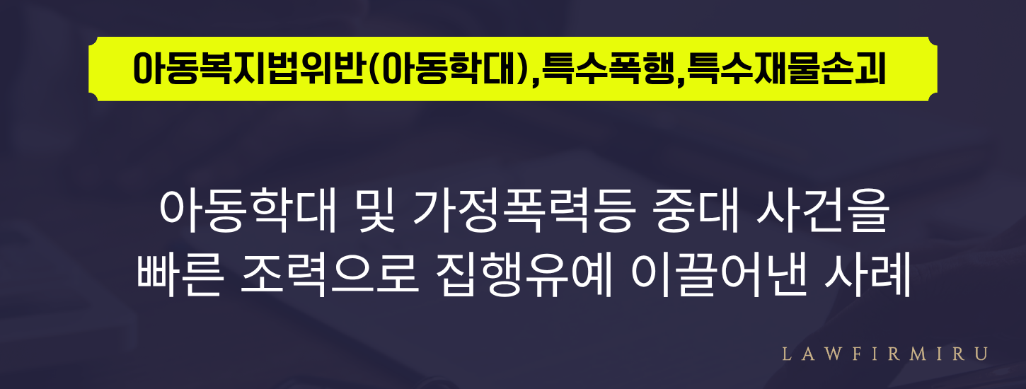 이번 사건은 아동학대,특수폭행.특수재물손괴죄가 겹친 실형을 면하기 아주 어려운 중한 범죄 였지만 법무법인 이루는 의뢰인을 대신하여 조심스럽게 피해자의 입장을 존중하며 원만하게 합의를 이끌어 냈으며 정확한 증거분석,양형에 영향을 줄 수 있는 요소들을 종합적으로 변호하여 실형 가능성이 높았던 사건에서 의미 있는 결과로 법원으로부터 집행유예 판결을 받은 성공 사례 입니다.