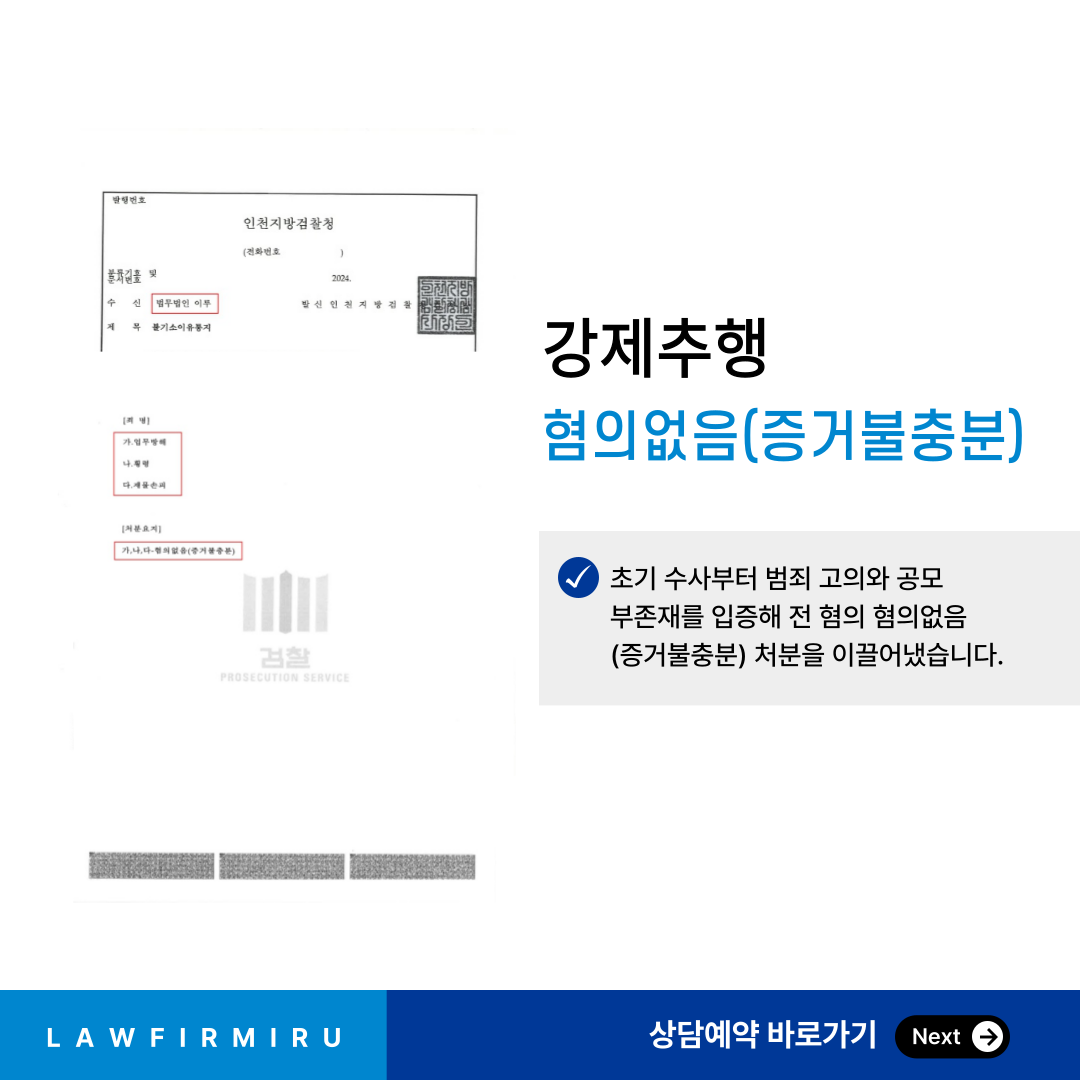 수사기관은 의뢰인의 진술, 변호인이 제출한 각종 자료 및 객관적 정황을 종합적으로 검토한 끝에, 본 사건과 관련하여 업무방해, 횡령, 재물손괴 혐의 전부에 대해 ‘혐의없음(증거불충분)’ 처분을 내렸습니다. 특히 수사기관은 문제 된 행위가 의뢰인이 직접 실행한 범행이 아니라, 현장에 상주하던 의뢰인 회사의 본부장이 민원 해결과 관할 행정기관의 점검에 대비하는 과정에서 선행적으로 이루어진 조치에 불과하다는 점에 주목하였습니다.