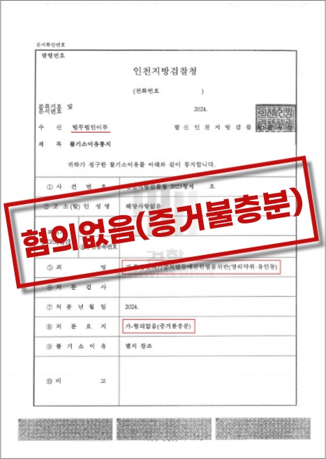 변호인의 적극적인 변론과 소명 자료 제출 덕분에 검찰은 의뢰인에 대하여 범죄에 가담한 증거가 불충분하다고 판단했습니다. 그 결과, 의뢰인은 혐의없음(증거불충분) 처분을 받고 사건을 무사히 종결할 수 있었습니다.