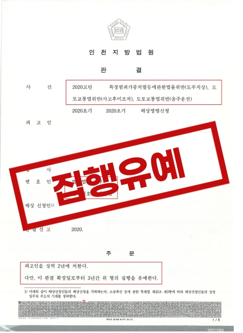 법원은 법무법인 이루가 제출한 모든 서류를 검토하여 의뢰인이 모든 범죄를 인정하고 진심으로 반성하고 있으며 벌금형 초과 전력이 없고 사고 초기부터 합의에 적극 조력하여 피해자들이 의뢰인의 처벌을 원치 않는다는 문서를 제출 하였다는 사실을 바탕으로 실형이 아닌 “집행유예” 를 선고 하였습니다.