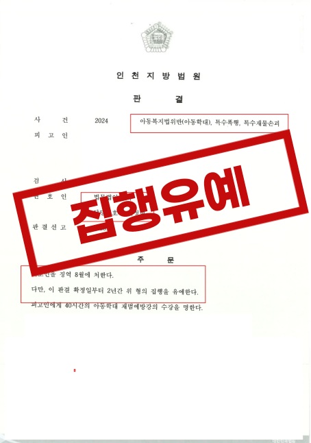 이번 사건은 아동학대,특수폭행.특수재물손괴죄가 겹친 실형을 면하기 아주 어려운 중한 범죄 였지만 법무법인 이루는 의뢰인을 대신하여 조심스럽게 피해자의 입장을 존중하며 원만하게 합의를 이끌어 냈으며 정확한 증거분석,양형에 영향을 줄 수 있는 요소들을 종합적으로 변호하여 실형 가능성이 높았던 사건에서 의미 있는 결과로 법원으로부터 집행유예 판결을 받은 성공 사례 입니다.