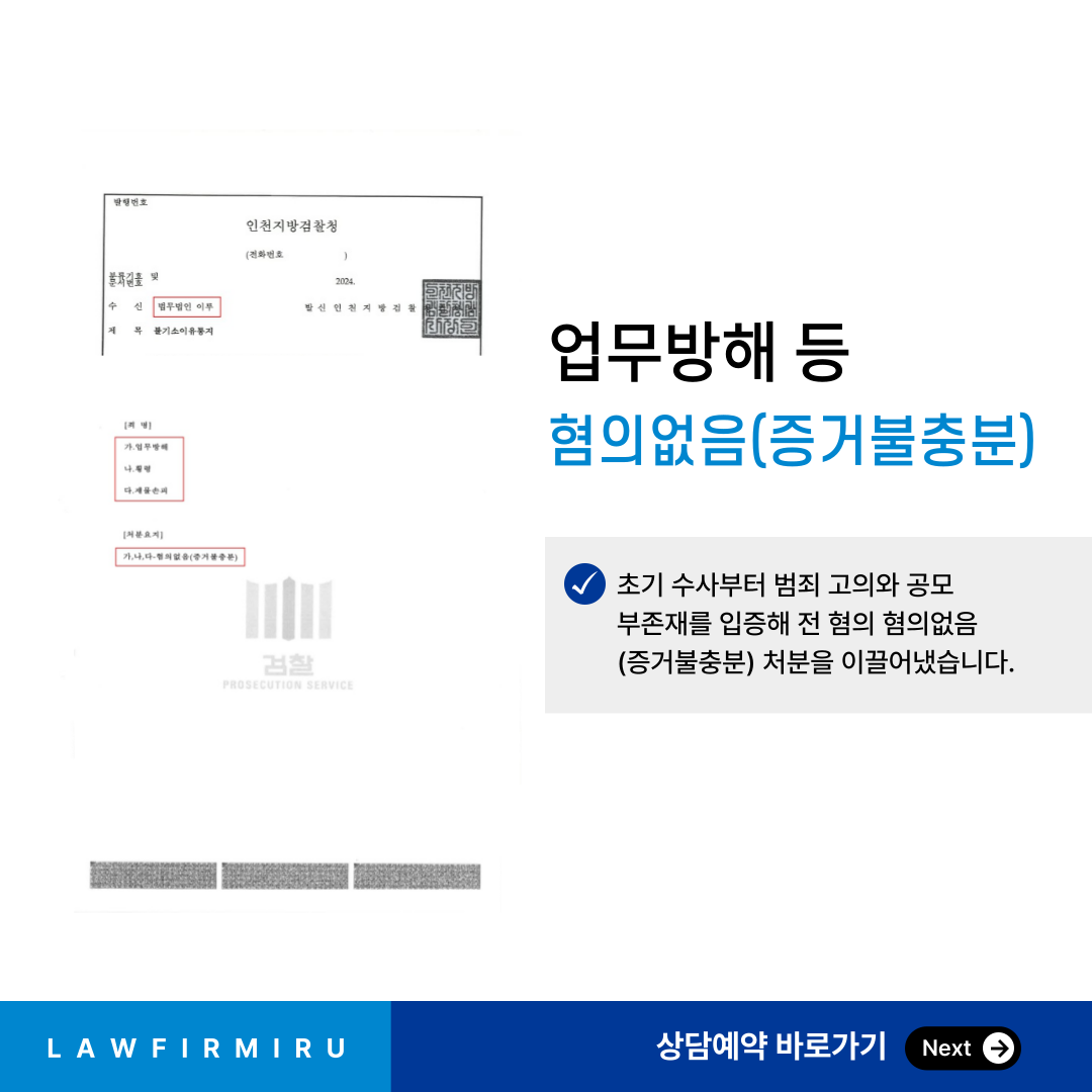 수사기관은 의뢰인의 진술, 변호인이 제출한 각종 자료 및 객관적 정황을 종합적으로 검토한 끝에, 본 사건과 관련하여 업무방해, 횡령, 재물손괴 혐의 전부에 대해 ‘혐의없음(증거불충분)’ 처분을 내렸습니다. 특히 수사기관은 문제 된 행위가 의뢰인이 직접 실행한 범행이 아니라, 현장에 상주하던 의뢰인 회사의 본부장이 민원 해결과 관할 행정기관의 점검에 대비하는 과정에서 선행적으로 이루어진 조치에 불과하다는 점에 주목하였습니다.